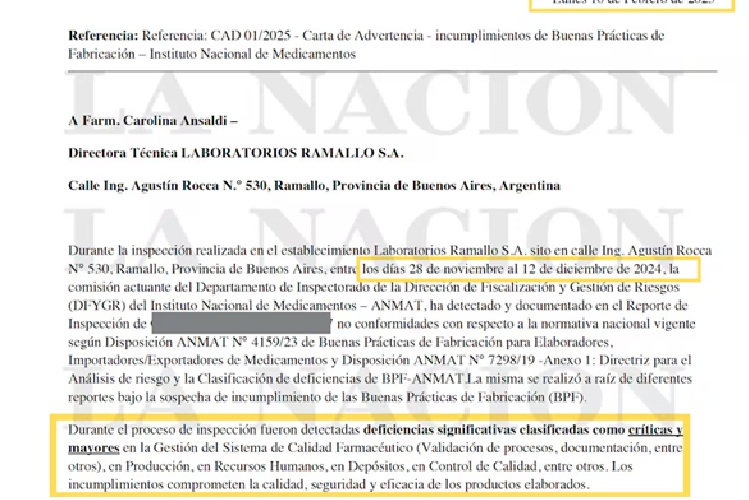 El documento que da cuenta de que el organismo estatal, que depende del Ministerio de Salud de la Nación, había realizado una inspección a Laboratorios Ramallo S.A., que fabricaba el fentanilo para la firma HLB Pharma, entre el 28 de noviembre y el 12 de diciembre del 2024 y había alertado por serias deficiencias en la producción y la seguridad del producto, fue publicado ayer por la periodista de La Nación, Camila Dolabjian.