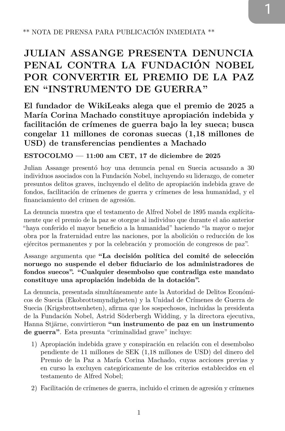 Assange solicita a las autoridades suecas: 1. Congelación inmediata de la transferencia pendiente del premio monetario de 11.000.000 de coronas suecas y de cualquier presupuesto restante relacionado y garantía de la devolución de la medalla. 2. Investigar a las personas nombradas y a los funcionarios de la Fundación y entidades asociadas por abuso de confianza, facilitación de crímenes de guerra y crímenes contra la humanidad y conspiración. 3. Incautación de actas de la junta directiva, correos electrónicos, chats grupales y registros financieros. 4. Interrogar a Widding, Stjärne y otros sospechosos. 5. Investigar a fondo a nivel nacional o remitir el asunto a la CPI (Estatuto de Roma, art. 25 (3) (c)) . “Esta denuncia pide la congelación inmediata de todos los fondos restantes y una investigación penal completa para evitar que el Premio Nobel de la Paz se convierta permanentemente de un instrumento de paz en un instrumento de guerra”, concluye Assange.