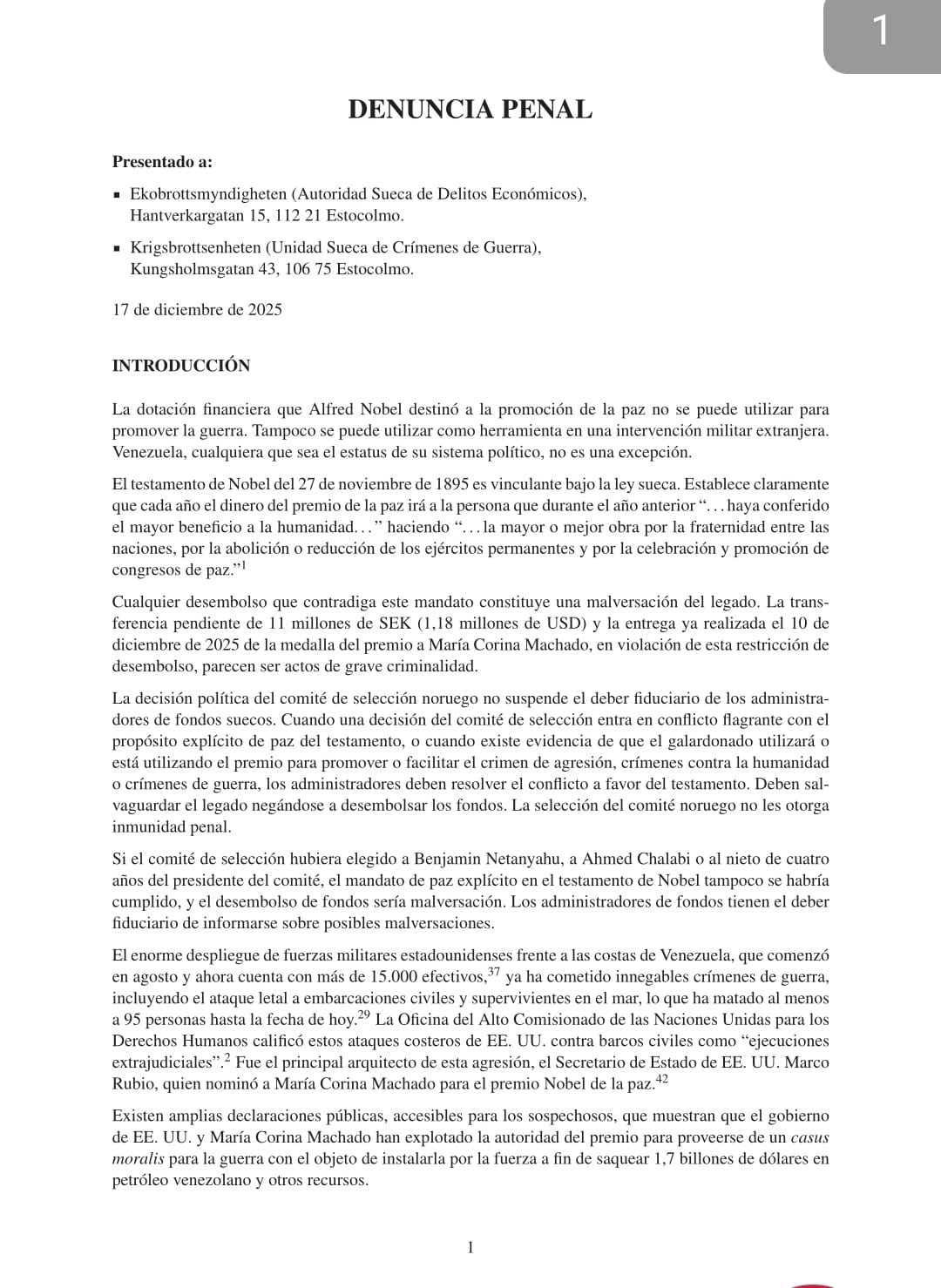 La denuncia, que fue presentada simultáneamente ante la Autoridad Sueca de Delitos Económicos (Ekobrottsmyndigheten) y la Unidad Sueca de Crímenes de Guerra (Krigsbrottsenheten), afirma que los sospechosos, entre ellos la presidenta de la Fundación Nobel, Astrid Söderbergh Widding, y la directora ejecutiva, Hanna Stjärne, convirtieron «un instrumento de paz en un instrumento de guerra», a través de una presunta «criminalidad grave», que incluía: 1) Abuso de confianza, apropiación indebida grave y conspiración en relación con el desembolso pendiente de 11 millones de coronas suecas (1,18 millones de dólares) del dinero del premio de la Paz a María Corina Machado, cuyas acciones anteriores y actuales la excluyen categóricamente de los criterios establecidos en el testamento de Alfred Nobel; 2) Facilitación de crímenes de guerra, incluido el crimen de agresión y crímenes contra la humanidad, violando las obligaciones de Suecia en virtud del artículo 25 (3) (c) del Estatuto de Roma, porque los acusados son conscientes de la incitación y respaldo de Machado a la comisión de crímenes internacionales por parte de los Estados Unidos, y sabían o deberían haber sabido que el desembolso de dinero del Nobel contribuiría a ejecuciones extrajudiciales de civiles y náufragos en el mar y están incumpliendo su obligación de cesar los desembolsos.