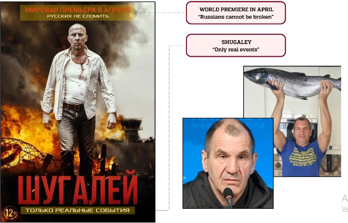 A la izquierda, un cartel de la película Shugaley, financiado por Prigozhin y estrenada en 2020. A la derecha, el agente de desinformación Shugaley.