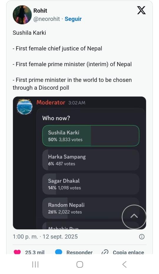 Nepal se vio sacudido por las protestas de la llamada «Generación Z» en septiembre de 2025, después de que las autoridades bloquearan el acceso a plataformas de redes sociales como Facebook, YouTube y Twitter/X, alegando el incumplimiento de las normativas locales que les exigían registrarse ante el gobierno. Al menos 76 personas murieron durante la violencia resultante, incluidos varios policías, lo que provocó la dimisión del primer ministro comunista KP Sharma Oli menos de una semana después del inicio de la violencia.