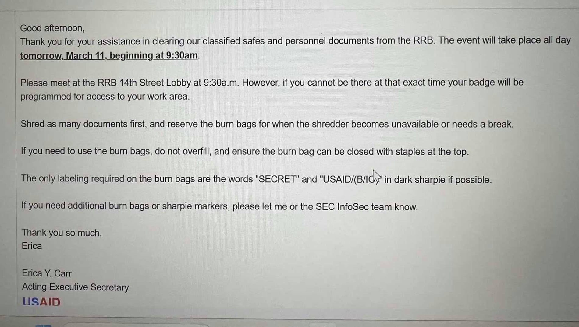 El correo electrónico, enviado por la secretaria interina de USAid , Erica Y Carr, instruye al personal sobre los procedimientos para limpiar “cajas fuertes clasificadas y documentos personales” mediante la destrucción y el uso de “bolsas para quemar” marcadas “SECRETO” durante todo el día del martes.