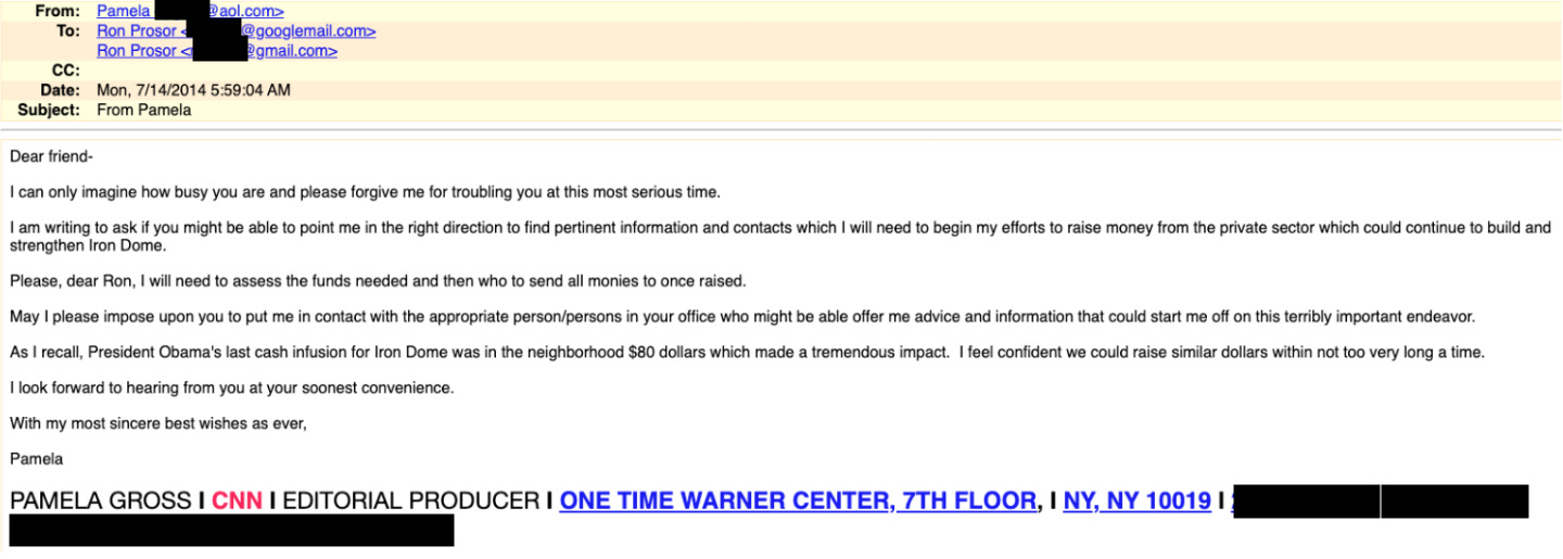 Al día siguiente, Gross volvió a escribir a Prosor para pedirle orientación a él y al Ministerio de Relaciones Exteriores de Israel sobre cómo comenzar. «Querido embajador: todavía no he comenzado ninguna recaudación de fondos en la Cúpula de Hierro, pero estoy ansioso por seguir adelante. Necesito recopilar información y espero que puedas ayudarme. Necesito saber los hechos, como, ¿cuánto dinero necesitan todavía para terminar la cúpula?», escribió la productora de CNN, en un correo electrónico que incluía sus afiliaciones profesionales en la sección de firmas.