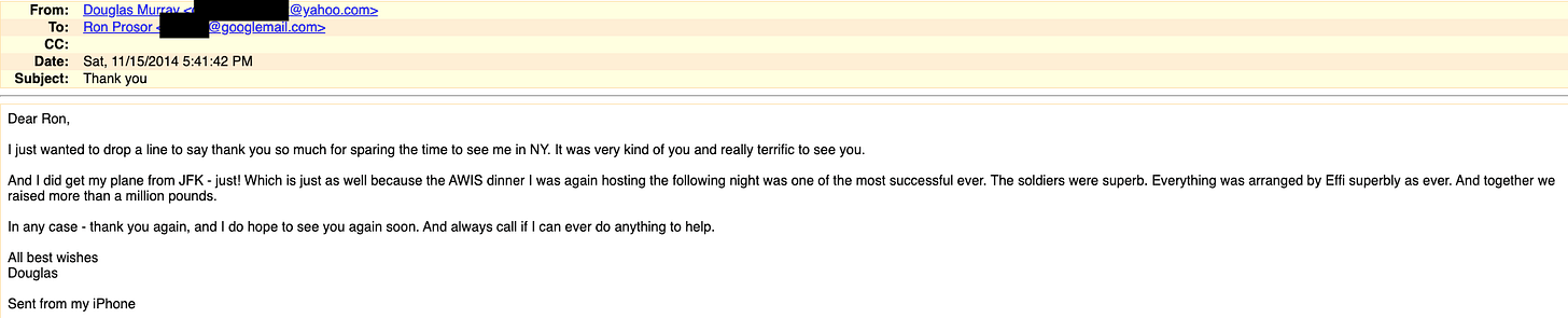 En ese momento, Murray también estaba brindando otros servicios en apoyo de Israel y sus esfuerzos militares. En noviembre de ese año, le escribió a Prosor para informarle que había organizado un evento que recaudó más de un millón de libras para una organización llamada «Asociación para el Bienestar de los Soldados Israelíes» (AWIS). Esa organización había sido creada para proporcionar fondos «directamente a los soldados [de las Fuerzas de Defensa de Israel] y las unidades de las FDI», y fue fundada originalmente en 1942 por el primer primer ministro de Israel, David Ben-Gurion. (En 2015, AWIS se fusionó con otra organización y ahora se llama Asociación de Soldados de Israel).