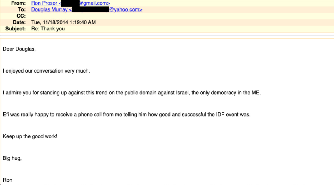 Murray agregó que esperaba volver a ver al embajador pronto y le dijo que «siempre llame si alguna vez puedo hacer algo para ayudar». Tres días después, Prosor le dio a Murray un pulgar hacia arriba por su buen trabajo en respuesta, agradeciéndole por sus esfuerzos de recaudación de fondos y defensa para el gobierno israelí, mientras firmaba: «¡Sigan con el buen trabajo!».