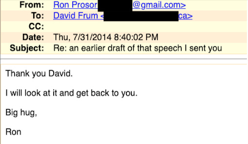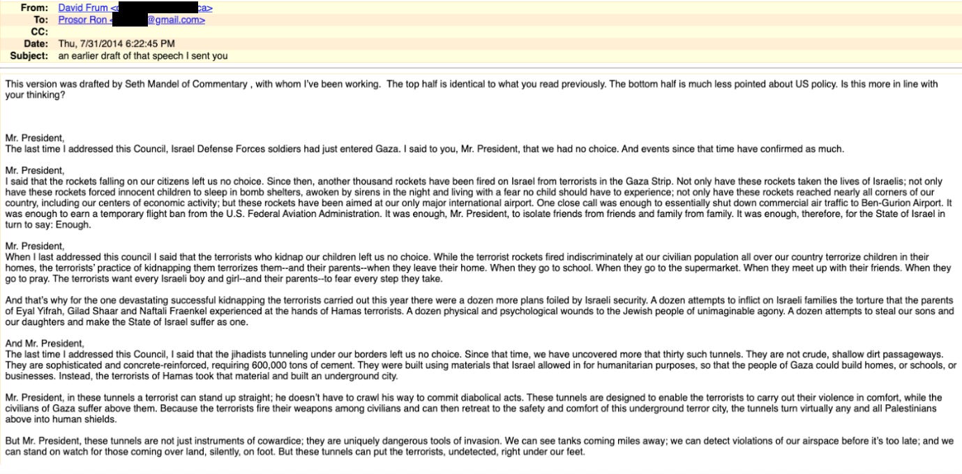 En un correo electrónico del 31 de julio de 2014, durante el apogeo de la ofensiva militar israelí en Gaza, Frum envió un mensaje a Prosor en el que se presentaba el borrador del texto de un discurso para el embajador. En el mensaje, Frum dijo que había estado trabajando en el borrador con su colega escritor Seth Mandel, empleadode la publicación neoconservadora Commentary. En el mensaje, titulado «un borrador anterior de ese discurso que les envié», Frum escribió: «Esta versión fue redactada por Seth Mandel de Commentary, con quien he estado trabajando. La mitad superior es idéntica a la que leíste anteriormente. La mitad inferior es mucho menos aguda sobre la política estadounidense. ¿Está esto más en línea con tu pensamiento?»