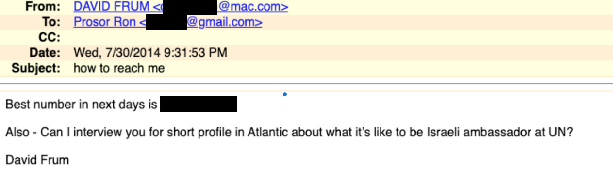 El día antes de enviarle el discurso a Prosor, Frum se había comunicado con el embajador desde una dirección de correo electrónico separada en una capacidad diferente, como periodista que aparentemente tenía como objetivo perfilar un tema. Frum le preguntó a Prosor: «Además, ¿puedo entrevistarlo para un breve perfil en Atlantic sobre cómo es ser embajador israelí en la ONU?»