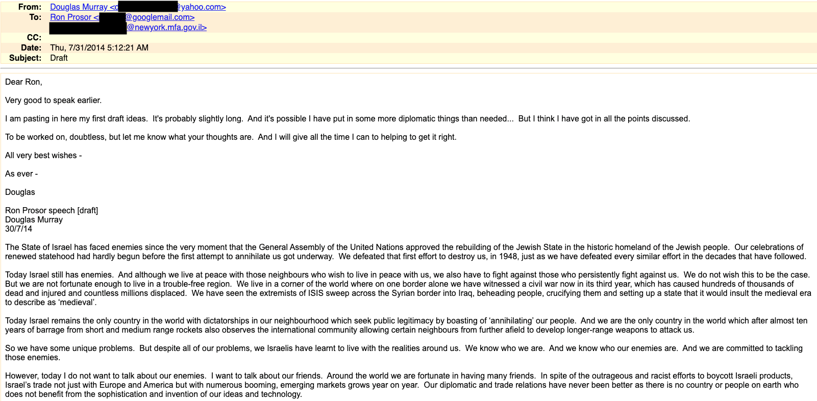 En un mensaje titulado simplemente, «Borrador», Murray le escribió a Prosor el 31 de julio de 2014: «Querido Ron, es muy bueno hablar antes. Estoy pegando aquí mis primeras ideas de borrador. Probablemente sea un poco largo. Y es posible que haya puesto algunas cosas más diplomáticas de las necesarias… Pero creo que he llegado a todos los puntos discutidos». El discurso contenía el discurso sugerido por el propio Murray para que Prosor lo pronunciara ante la ONU, que incluía frases como: «Nosotros, los israelíes, hemos aprendido a vivir con las realidades que nos rodean. Sabemos quiénes somos», críticas a los «esfuerzos escandalosos y racistas para boicotear los productos israelíes» y comentarios despectivos sobre los musulmanes europeos.
