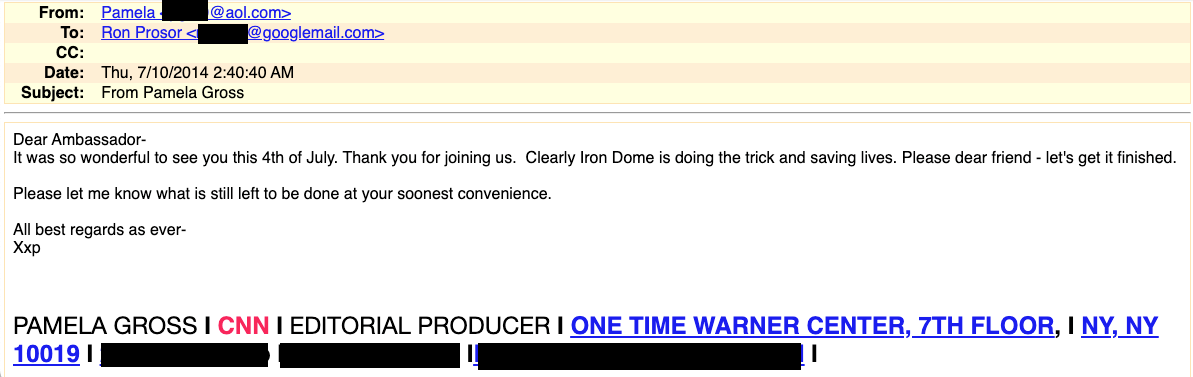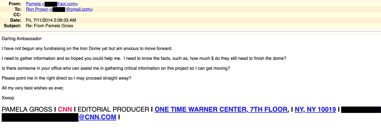 En correos electrónicos a Prosor durante varios años, Pamela Gross, en ese momento productora editorial de CNN, se puso en contacto con el embajador para contratarlo como invitado, pero también lo invitó a fiestas de cumpleaños y organizó cenas con ella y su esposo, James (Jimmy) Finkelstein, el propietario en ese momento de la publicación The Hill. (The Hill también era dueño del programa, «Rising», donde Ryan Grim de Drop Site se desempeñó anteriormente como coanfitrión). Además de sus cálidos lazos personales, Gross también solicitó la ayuda de Grossor en un esfuerzo privado para recaudar fondos para suministrar el sistema de defensa antimisiles Cúpula de Hierro de Israel.