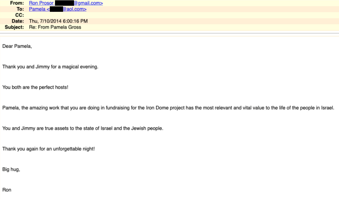 En un mensaje fechado el 10 de julio de 2014, Gross le escribió a Prosor: «Estimado embajador: fue maravilloso verlo este 4 de julio. Gracias por acompañarnos. Claramente, Iron Dome está haciendo el truco y salvando vidas. Por favor, querido amigo, terminémoslo. Por favor, hágame saber lo que aún queda por hacer lo antes posible».